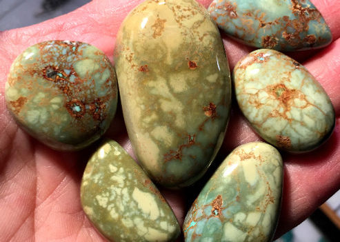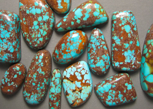 The historic Aztec Mine is located in the Royston Mining District of Esmeralda and Nye Counties, Nevada. The Aztec name for these claims goes as far back as 1903. Lee Hand mined this area back in the 1930's, and our claims cover much of his original workings. Aztec produces some of the classic looks of the Royston district with it's baby blues and wild greens often accented with blonde and red webbing and matrix. The mine also produces very light blue, almost white nuggets that are hard and take a super bright polish...a rare occurrence in the turquoise world! We own and operate this mine with Philip Chambless, who has owned claims in the Royston area for over 20 years now!